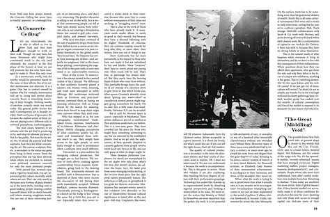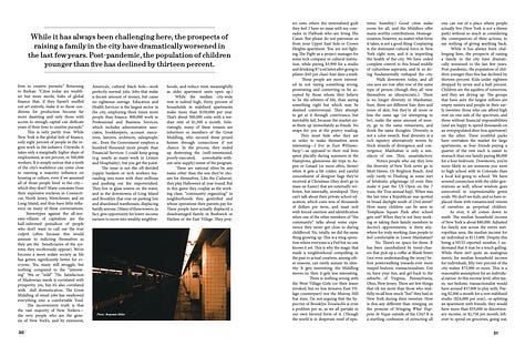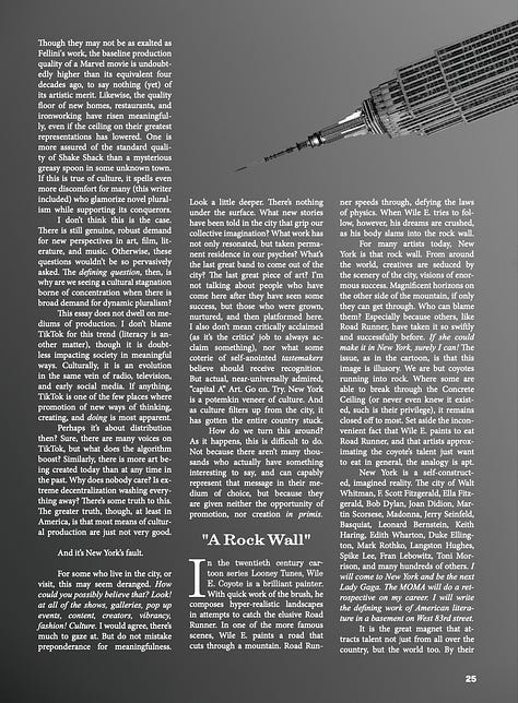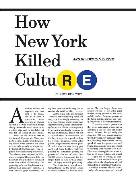 ’s compelling polemic does just that, explaining how the city went from the imperfect dreamland that gave us Whitman, Didion, and Dylan to a place that has produced little of lasting artistic value over the last ten years. In 8,000 words, and nearly as many data points, Coby excoriates aspects of New York’s culture and regulatory policy before suggesting pragmatic guidelines on how to build it back to its former glory.The entire essay is posted below. But as the image gallery shows, it looks more beautiful and feels better in print. If you’d like to get a copy, subscribe via Substack or send $20 here. Shipping is included in the price, or you can pick yours up at the launch party.