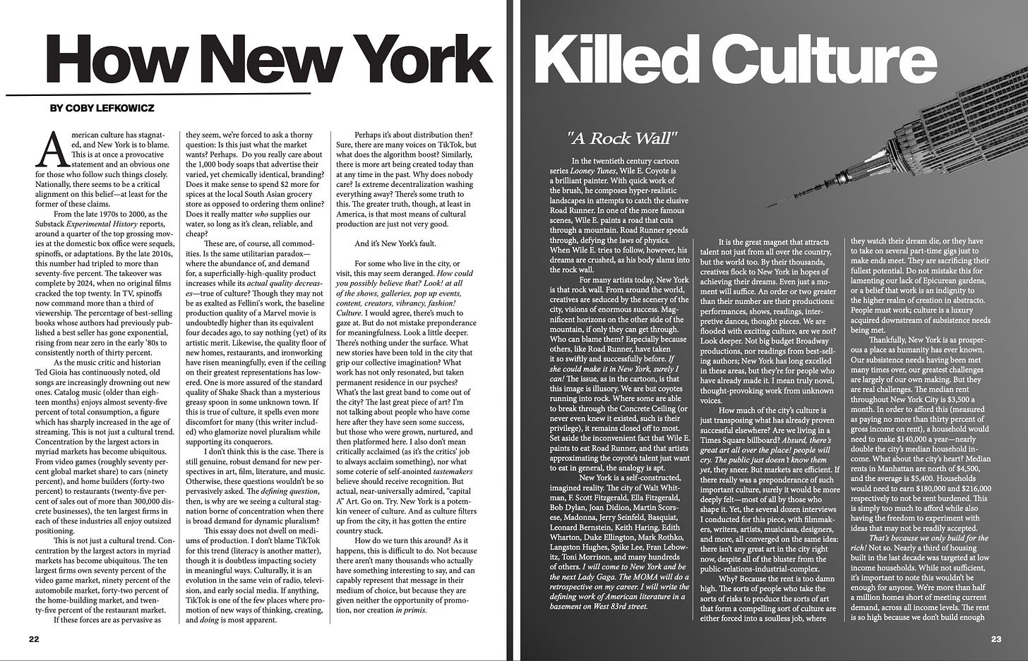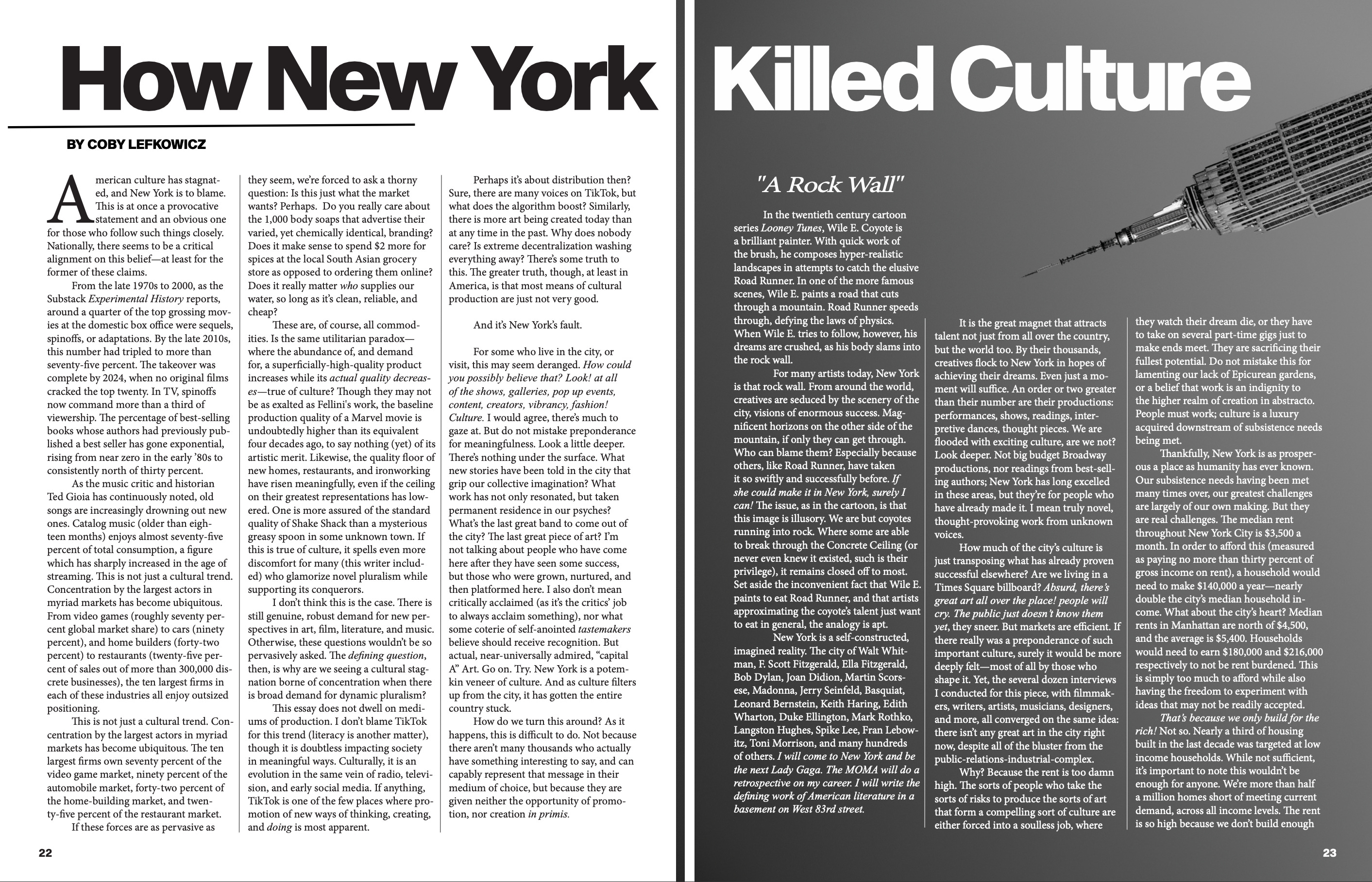 An essay, “How New York Killed Culture (And What We Can Do to Save It),” by