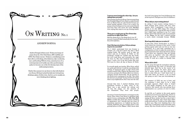 I love boxing. I’m Puerto Rican. I grew up watching Tito Trinidad, Miguel Cotto. I have a couple friends here in Miami that are only friends because we watch boxing together. I love it as a sport. I’m gonna write a boxing novel at some point.